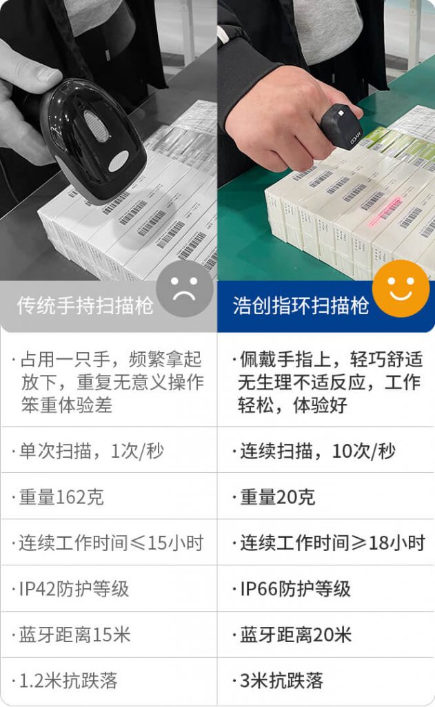 使用浩创指环的连续扫描模式,每秒可以扫描10次左右,效率提升5~10倍,大大降低了药监码扫描的人力资源成本,缩短扫描时间,有利于基于药监码的药品安全监控系统在国内的推广。